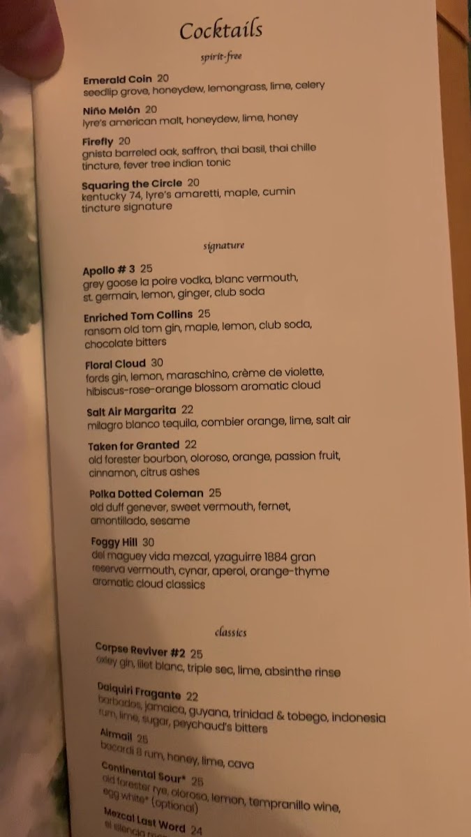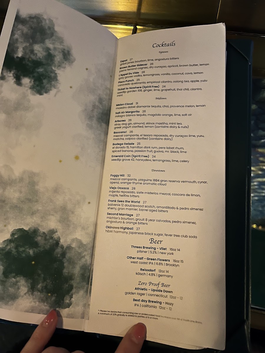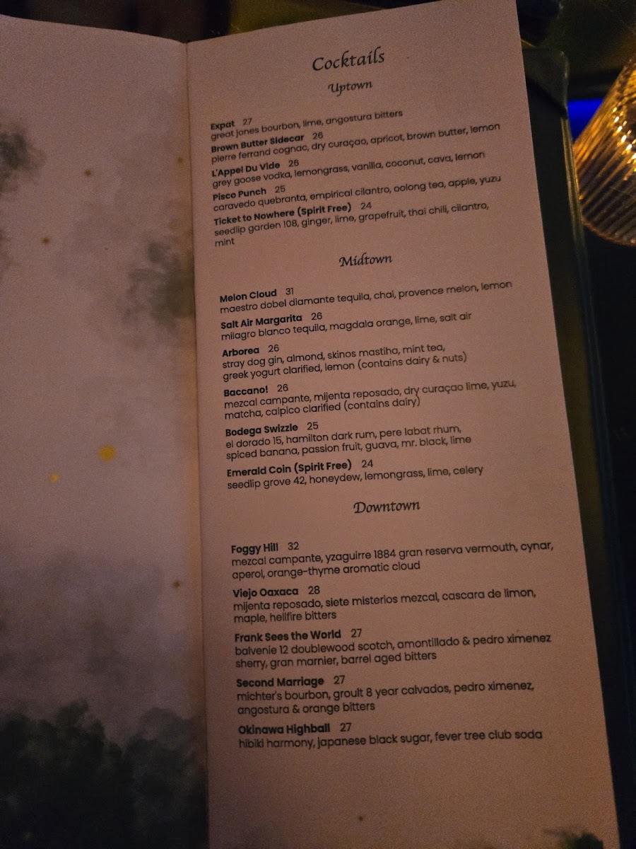 The menu showcases an impressive array of drinks designed to captivate your senses. Highlights include the Expat Great Jones Bourbon with lime and mint, and the luxurious Brown Butter Sidecar featuring Pierre Ferrand Cognac. Each cocktail is meticulously crafted, with a balance of flavors that elevates your drinking experience. For those seeking a non-alcoholic option, the Ticket to Nowhere offers a refreshing tonic without the spirits.
